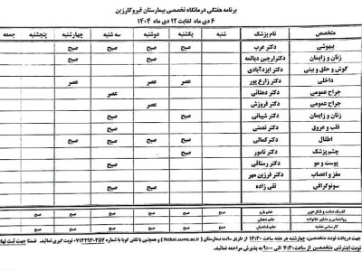 برنامه هفتگی حضور پزشکان متخصص بیمارستان امام محمد باقر (ع) قیروکارزین از تاریخ 6 دی ماه تا 12 دی ماه 1404 اعلام شد.